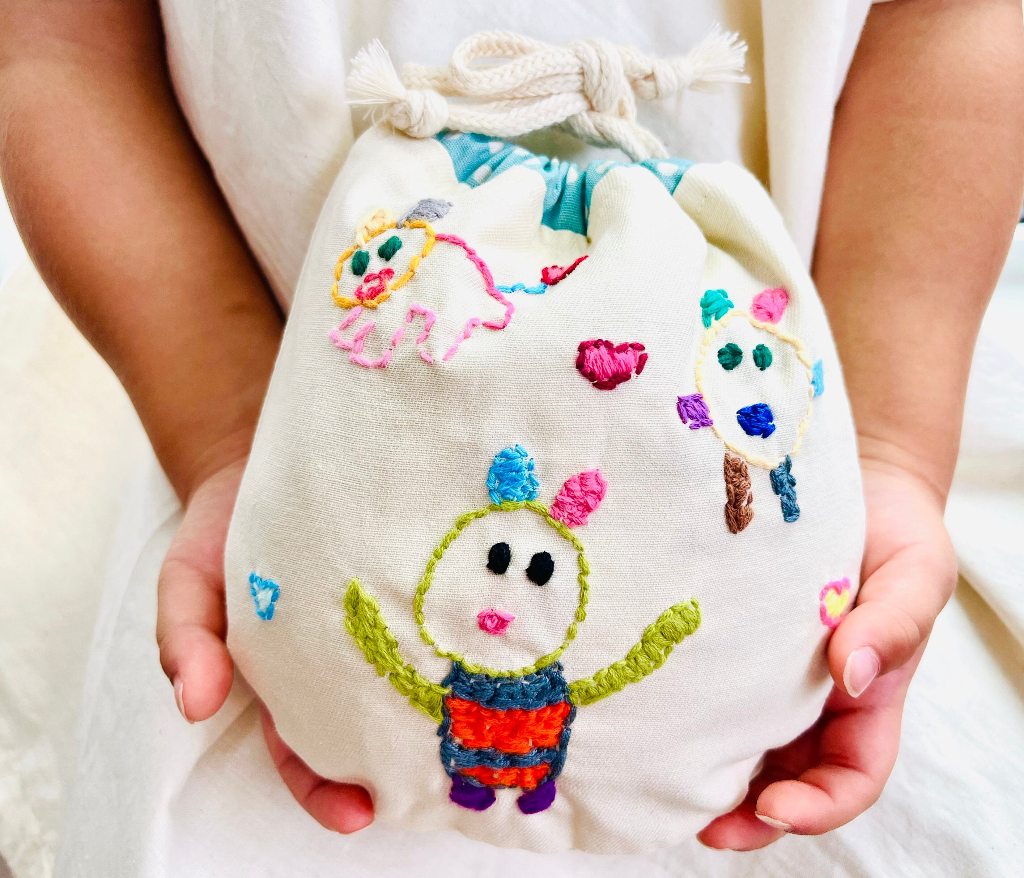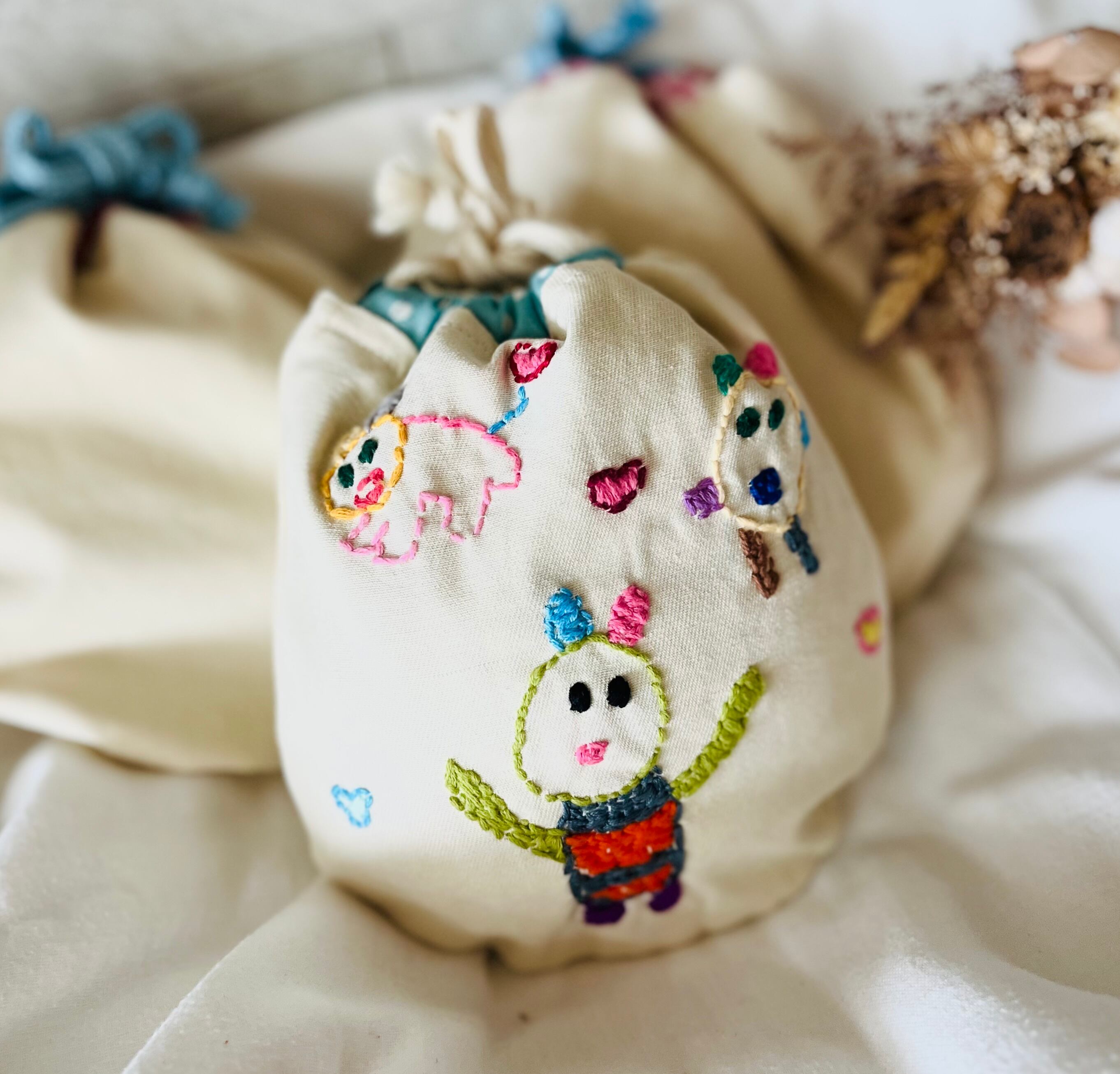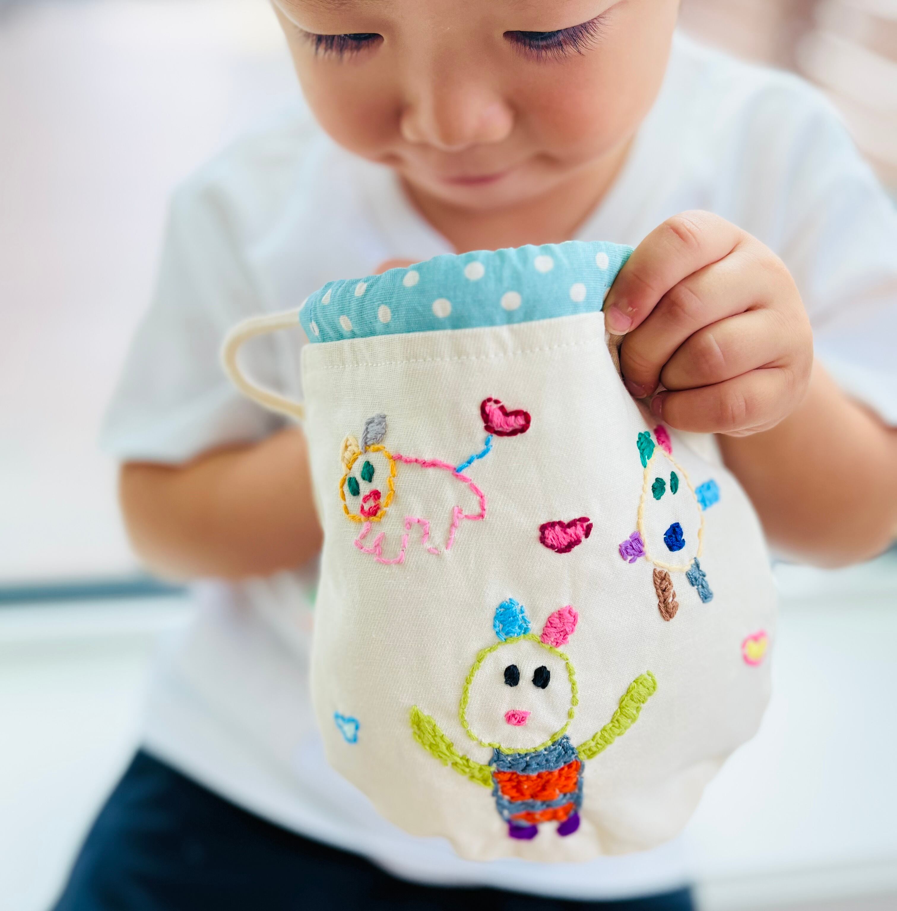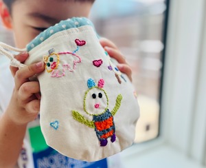 この巾着は、ユニークなデザインとやさしいカラフルな刺繍が魅力で、見る人を思わず笑顔にします。おもちゃやお菓子を収納するのに最適なサイズで、普段使いやお出かけにも大活躍します!