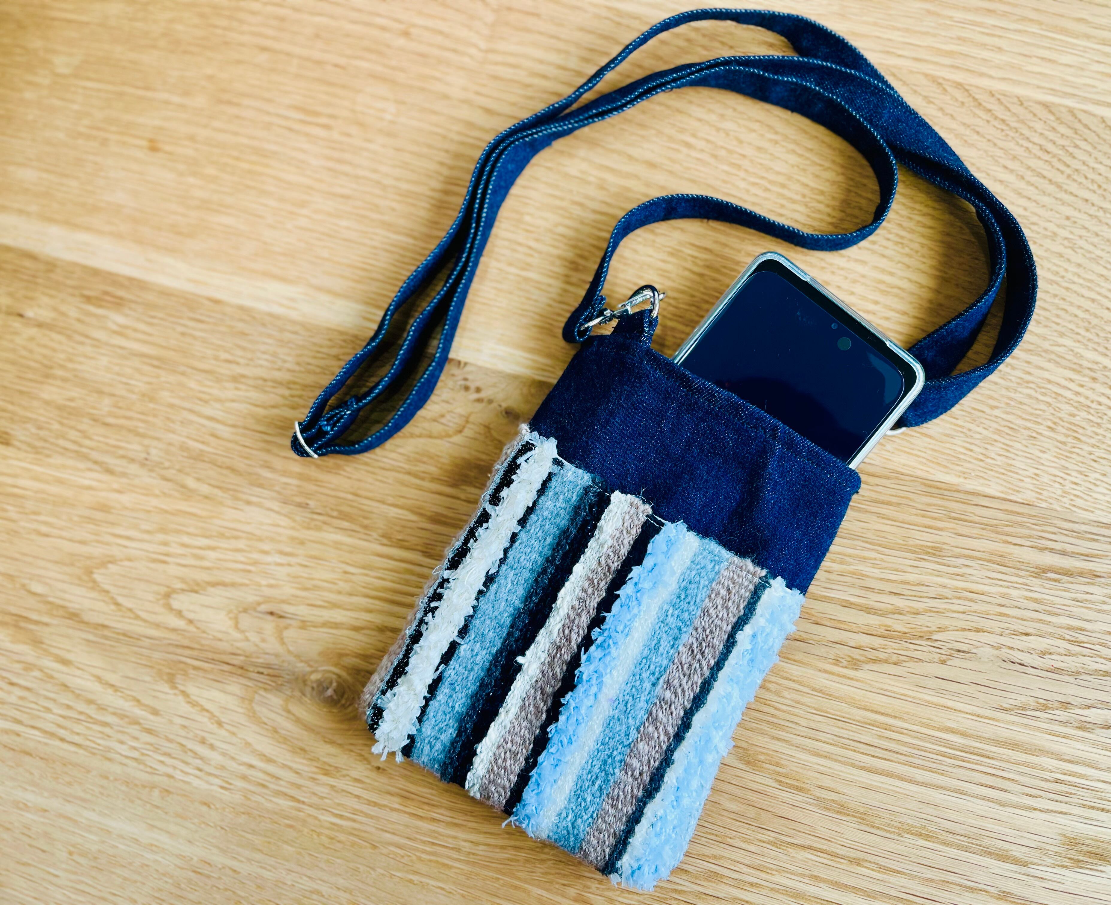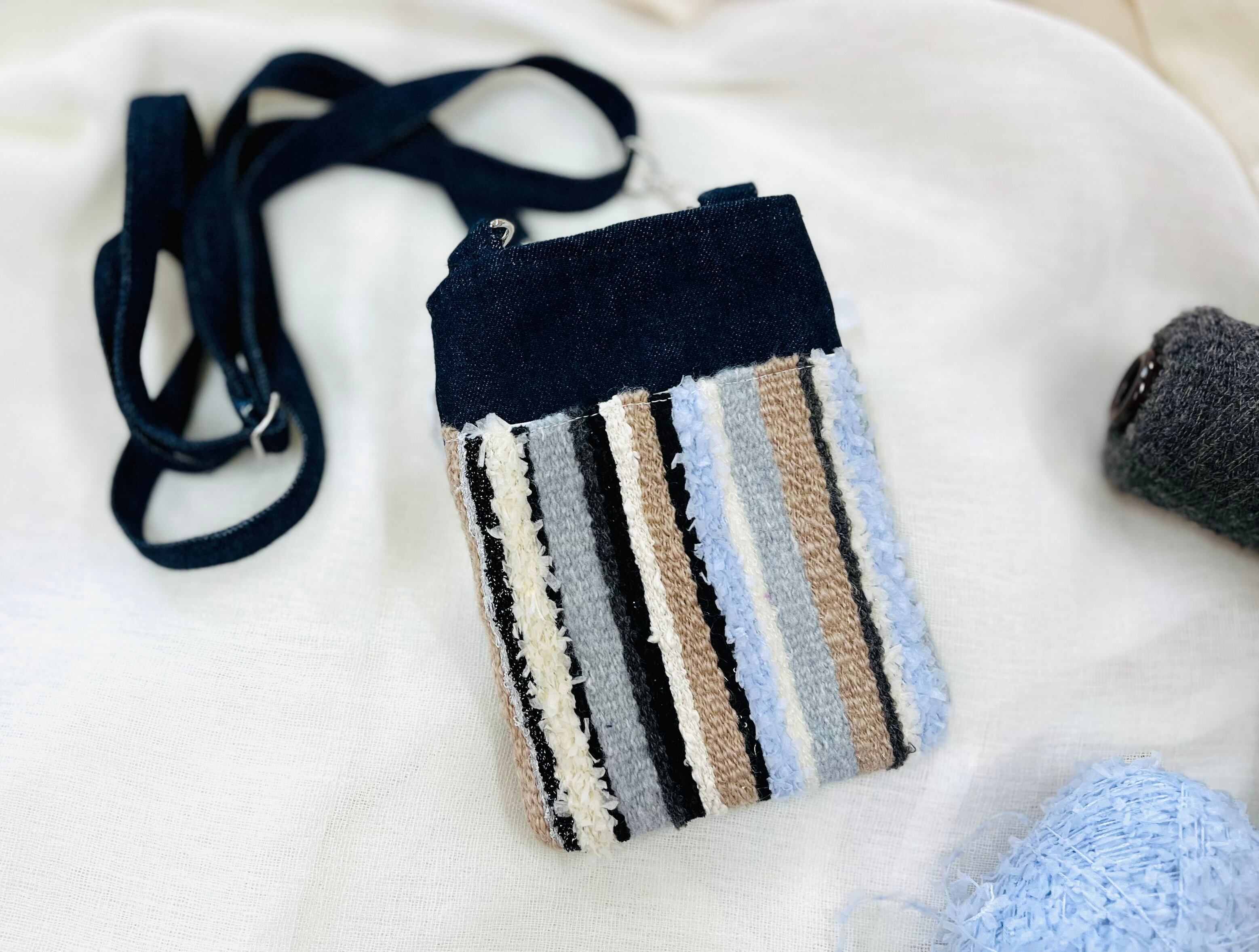 手織りならではのぬくもりと、デニムのしっかりとした丈夫さを合わせた、世界にひとつだけのスマホショルダーです♪