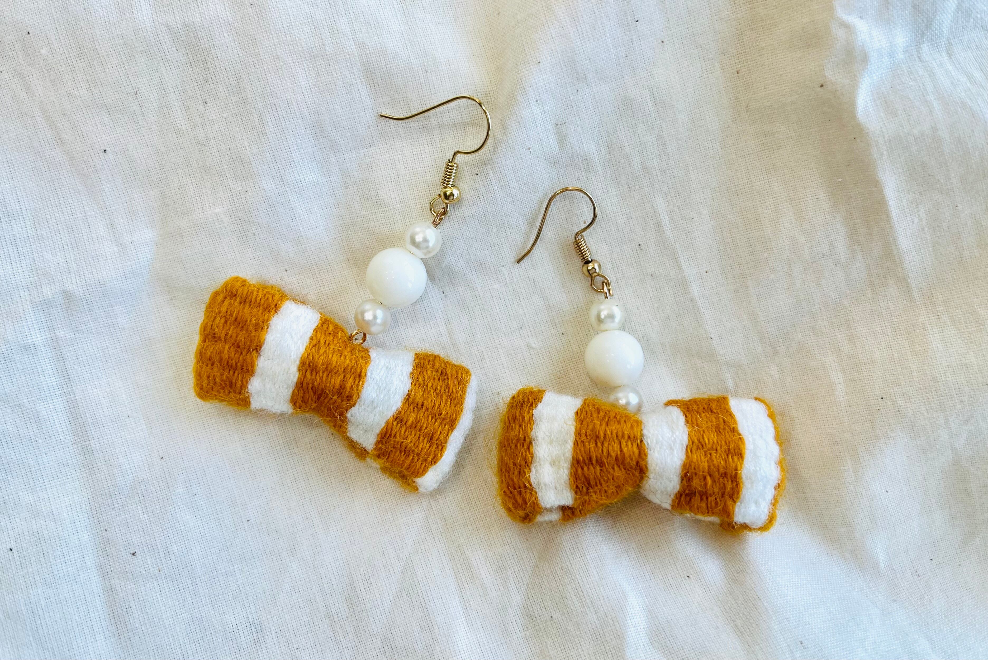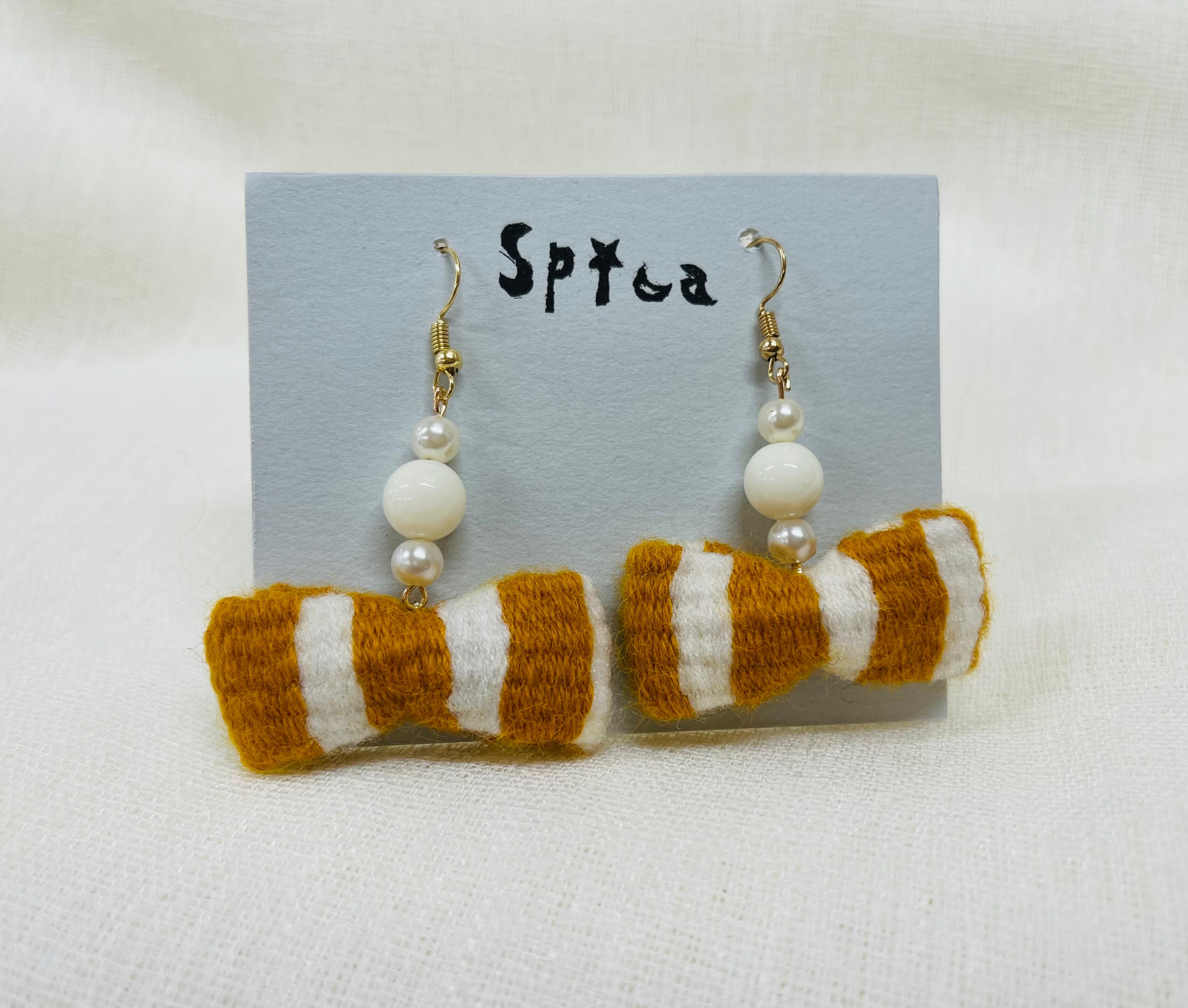 手織りの温かみを感じる、印象的なピアスです!大きなリボンにパールとビーズを合わせたデザインは、あなたのファッションのポイントとして輝きます♪