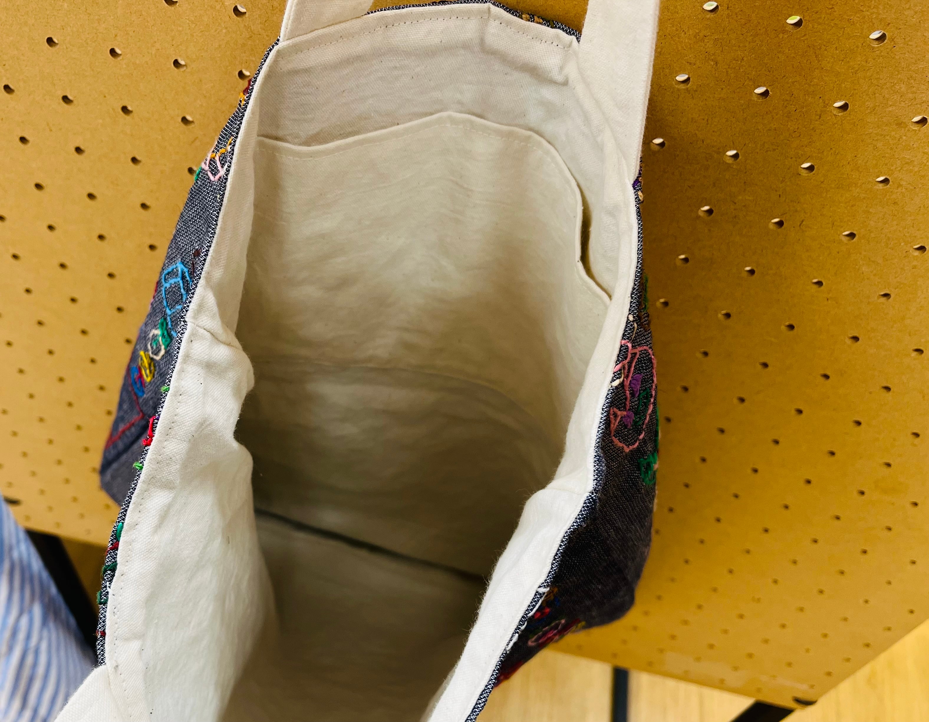 このトートバッグは、一枚の刺繍布を余すことなく使って制作されています。