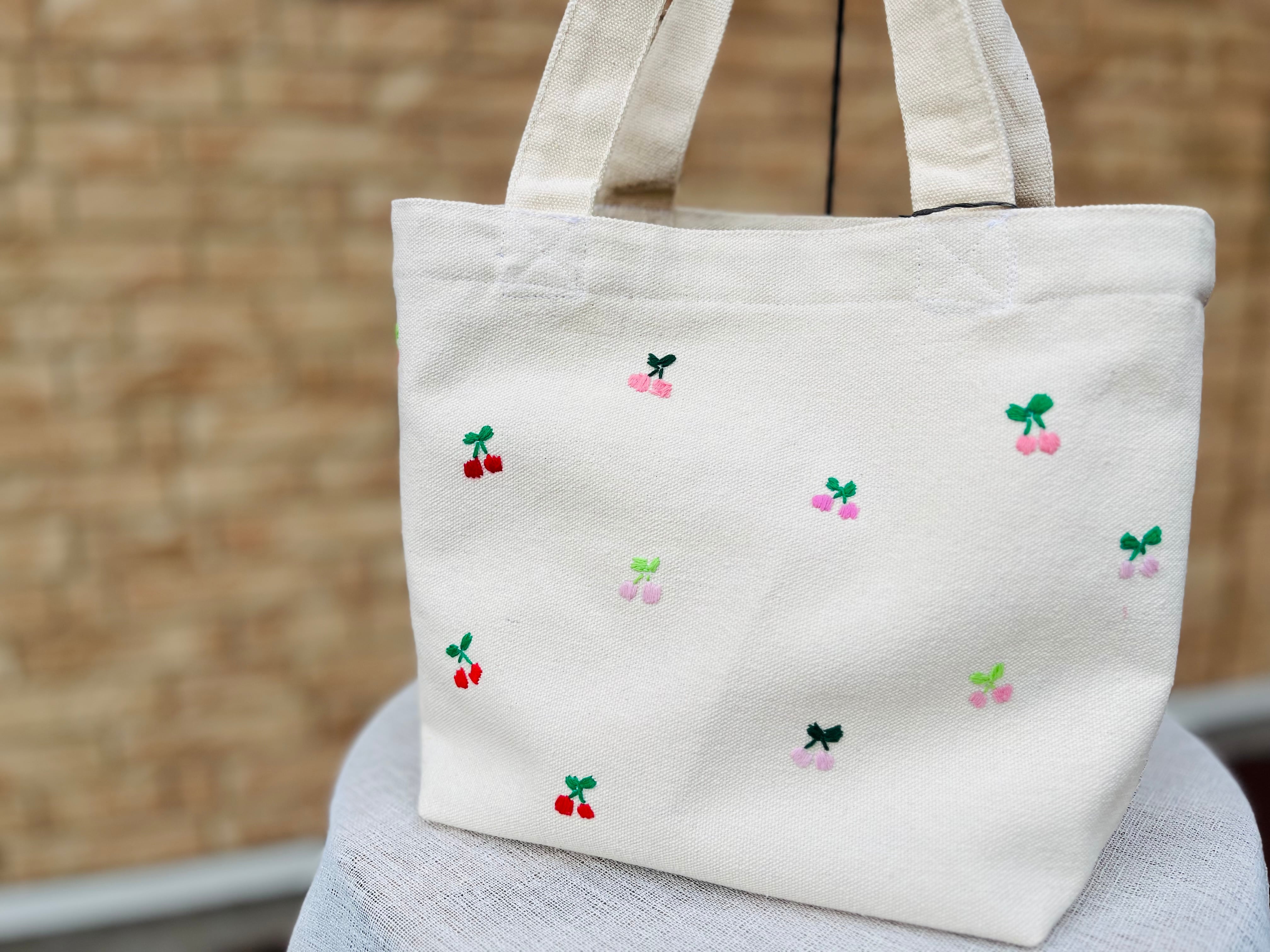 たくさんのさくらんぼの刺繍を散りばめたトートバッグです❤︎
