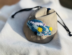 可愛らしいコロンとしたフォルムが特徴のこの巾着は、フレンチノット刺繍で表現された車のデザインがアクセント!自分だけのオリジナルスタイルを楽しめます。日常使いにはもちろん、ギフトにも最適です♪